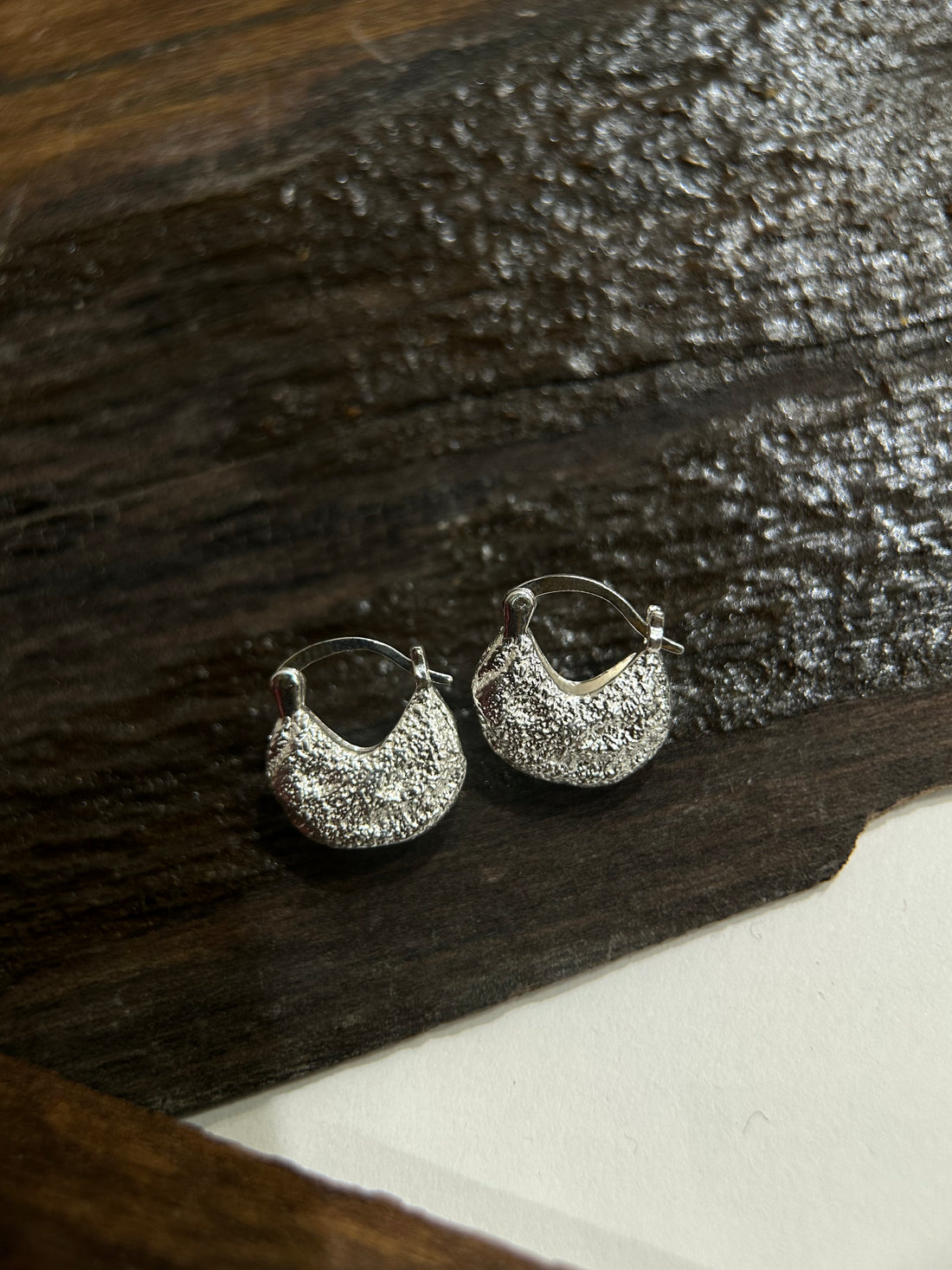 Material: Sterling silver Style: Mini hoop earrings with rounded bag-like drops and a textured sanded...
