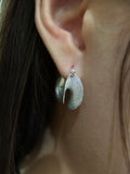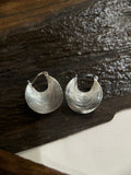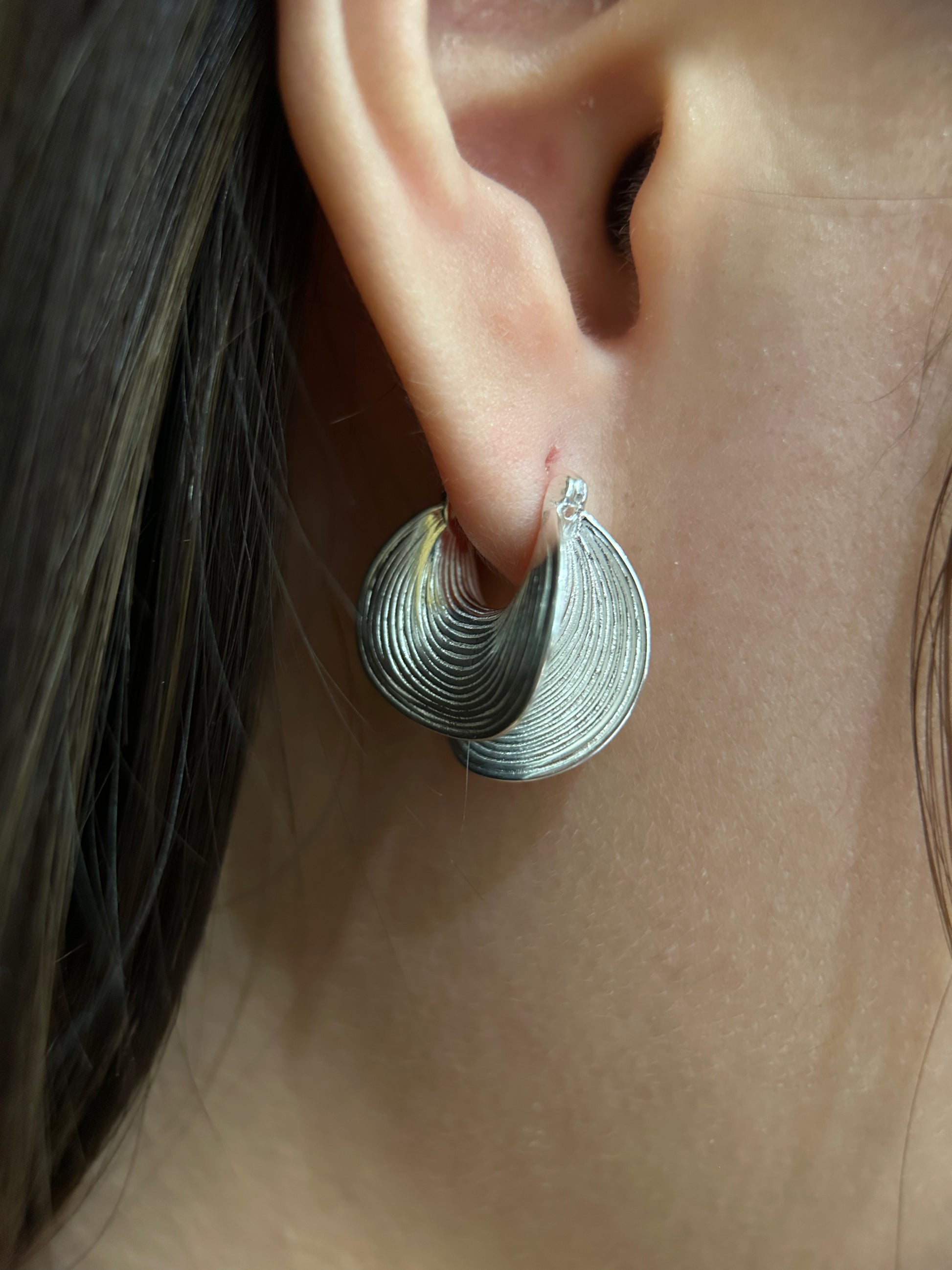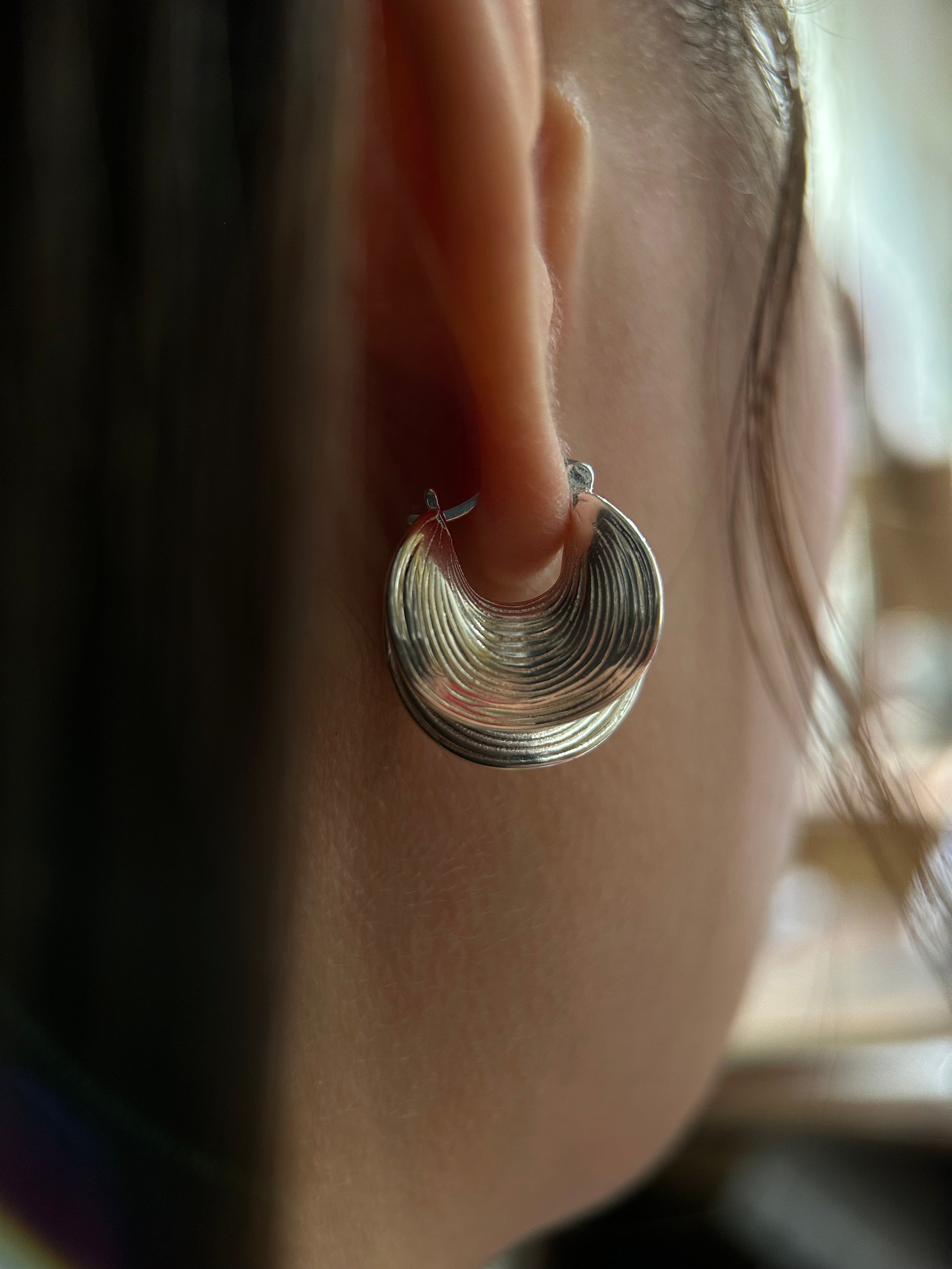 Style: Sculptural earrings with a double-layered form and fine engraved line texture