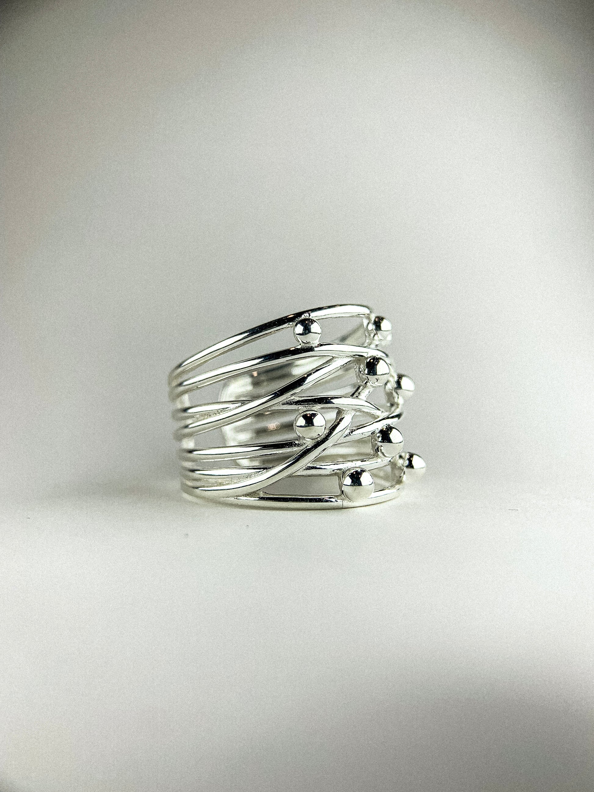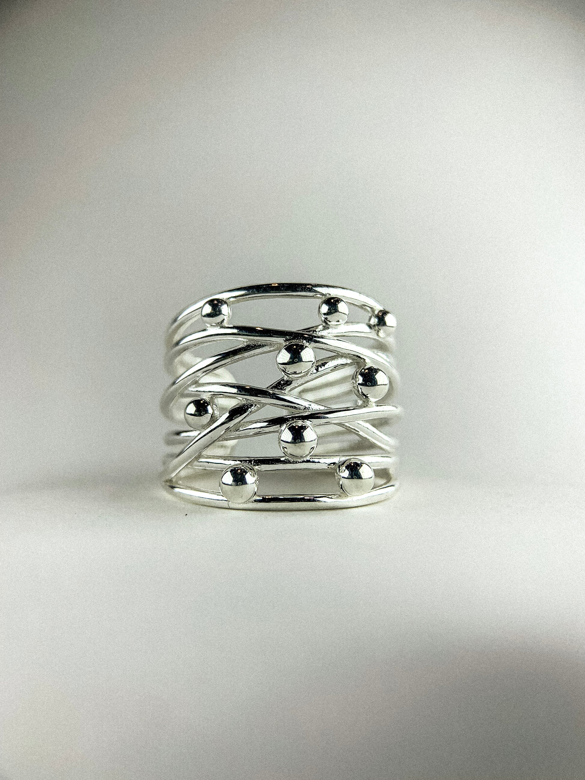 Design: Bold open band crafted from multiple crossing silver wires, accented with randomly placed polished silver spheres for a modern, organic look.