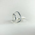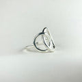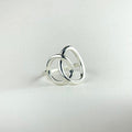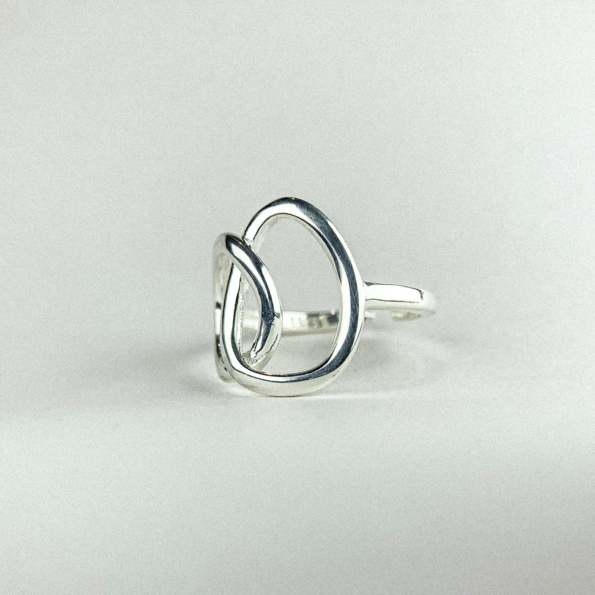A contemporary silver ring featuring two intertwined open loops that create a sense of effortless movement and harmony. Handcrafted in sterling silver, the design plays with balance and space — minimal yet bold, elegant yet modern. Perfect for those who appreciate sculptural jewelry with a clean and refined finish.