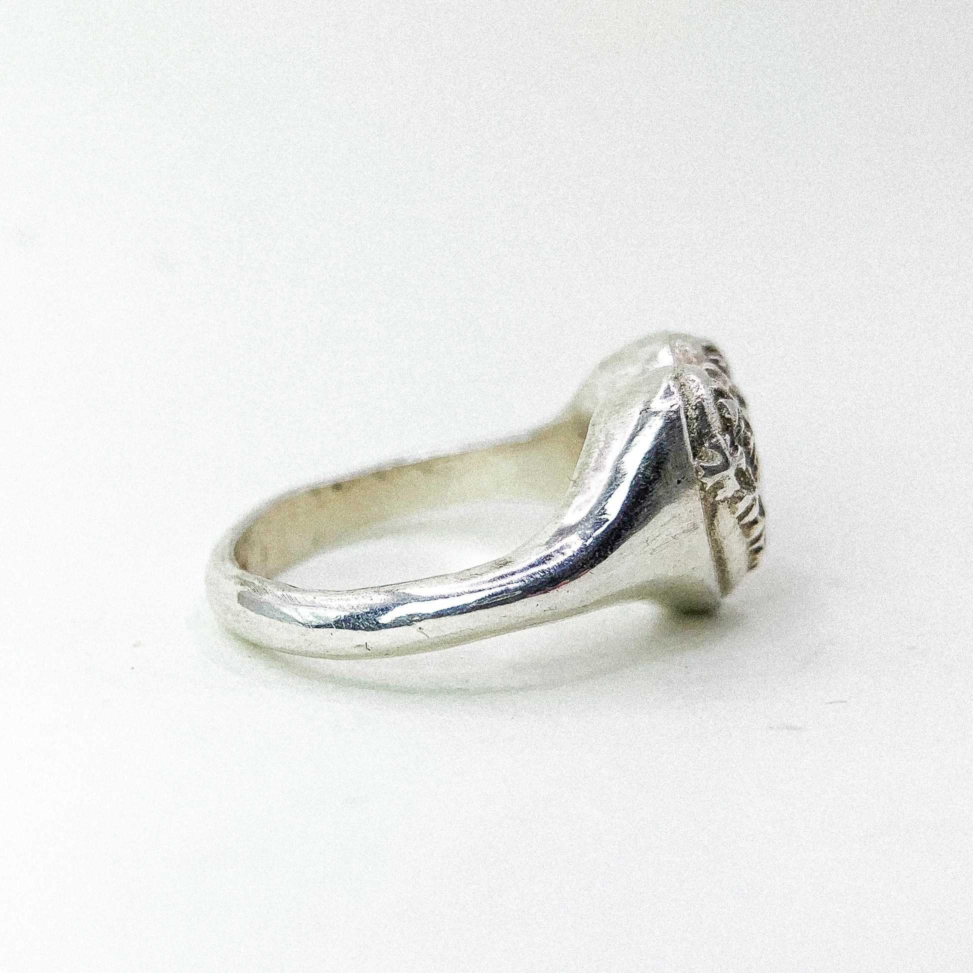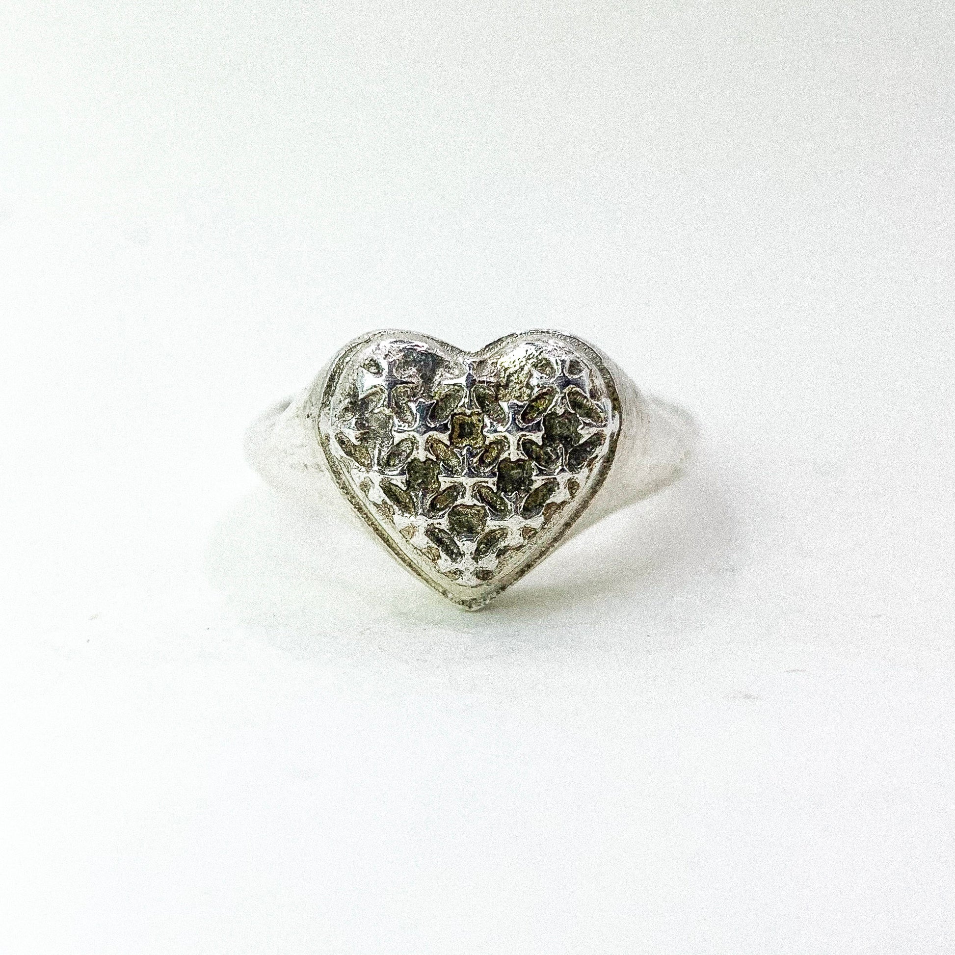 A charming heart-shaped ring crafted in sterling silver, featuring a textured surface made of tiny plus-shaped motifs. The subtle pattern adds dimension and sparkle, giving the piece a unique blend of sweetness and character. Perfect for everyday wear or as a meaningful gift symbolizing positivity and affection.