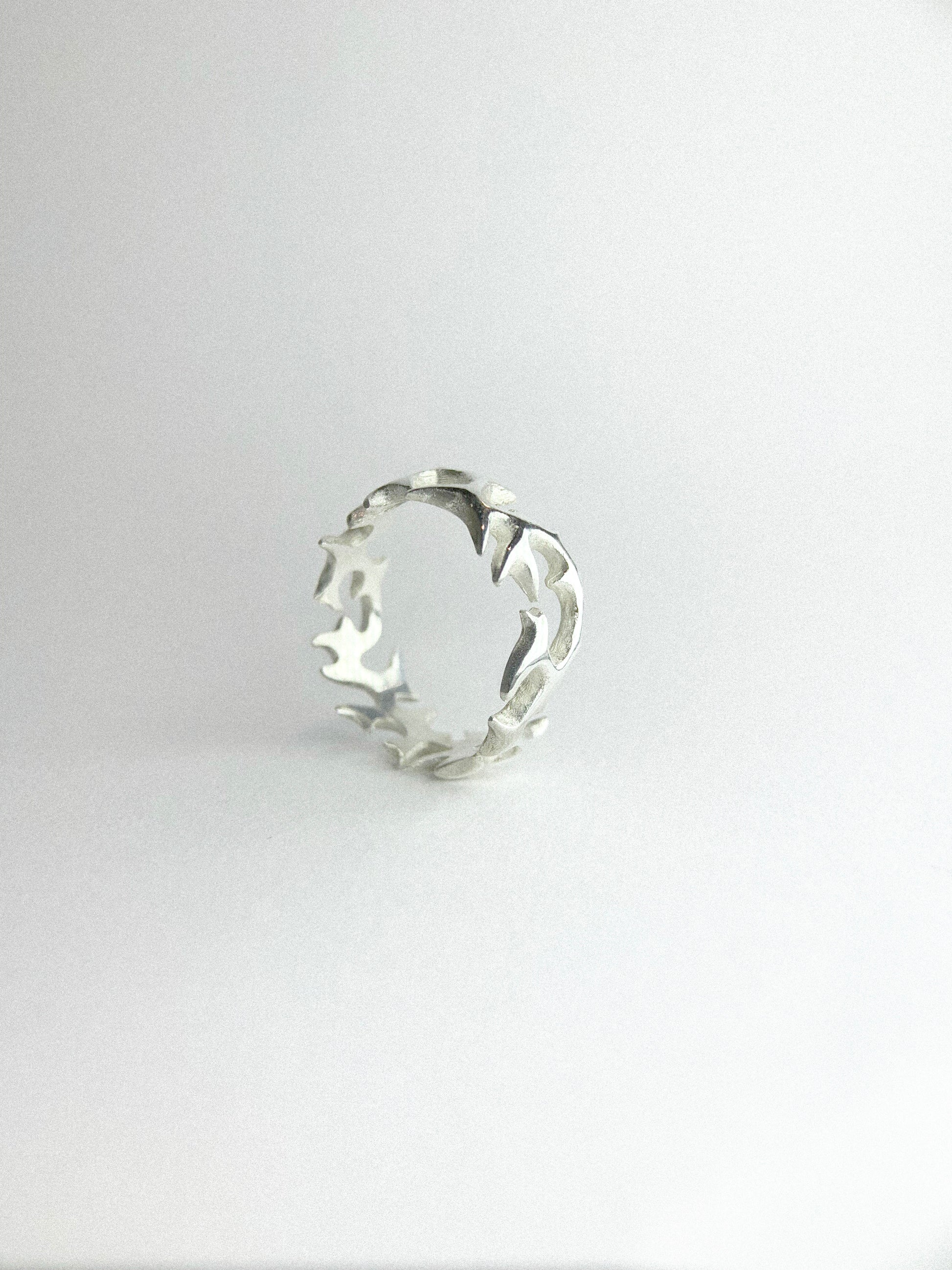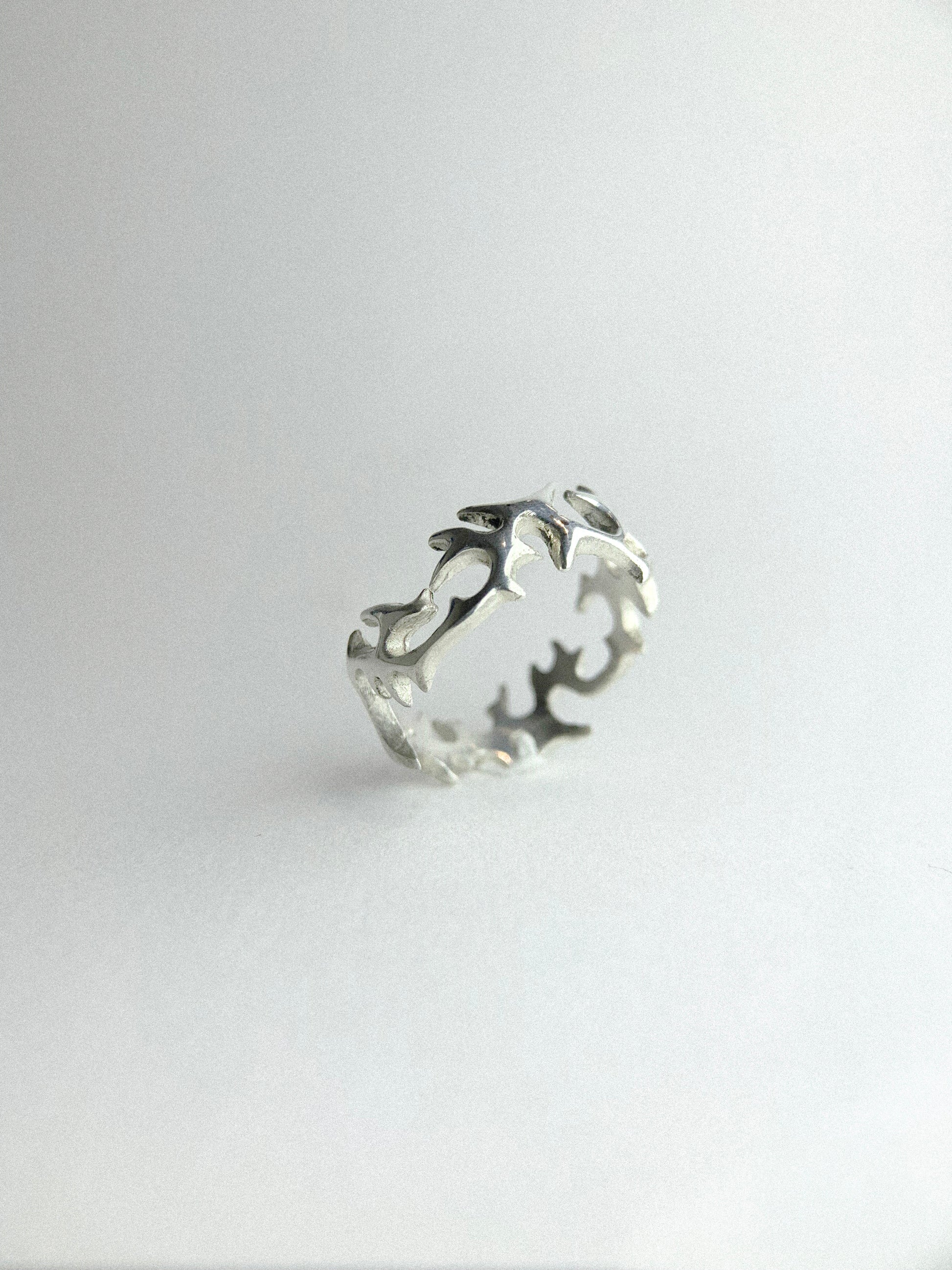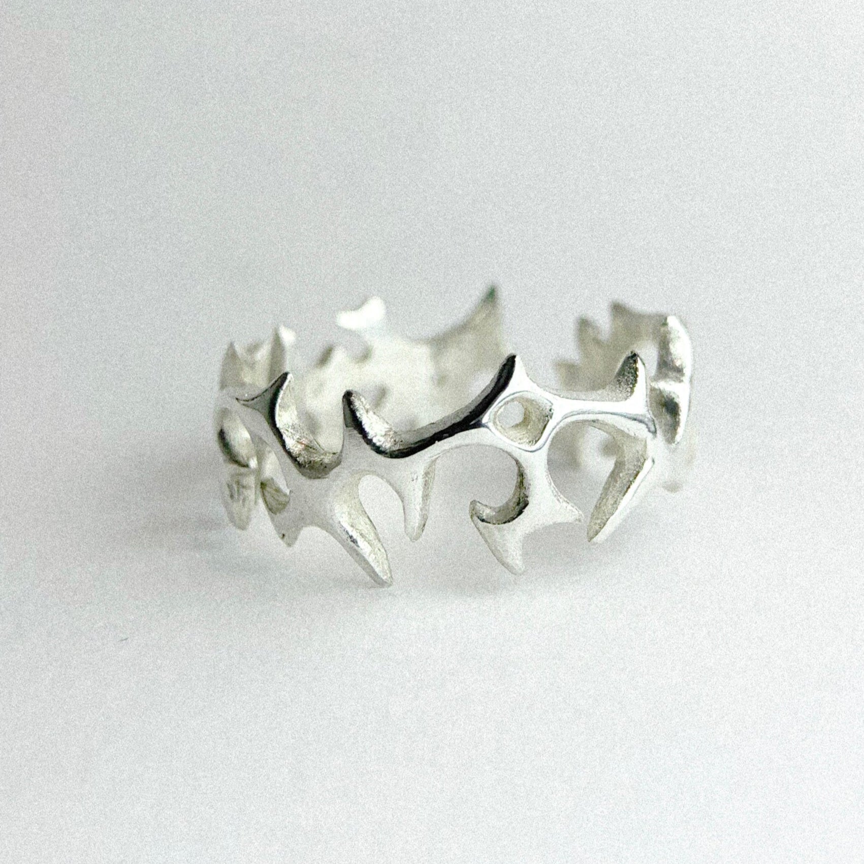 A bold sterling silver ring with sharp, open-cut tribal motifs. Its edgy design and polished finish make it a standout statement piece for everyday wear or special occasions.
