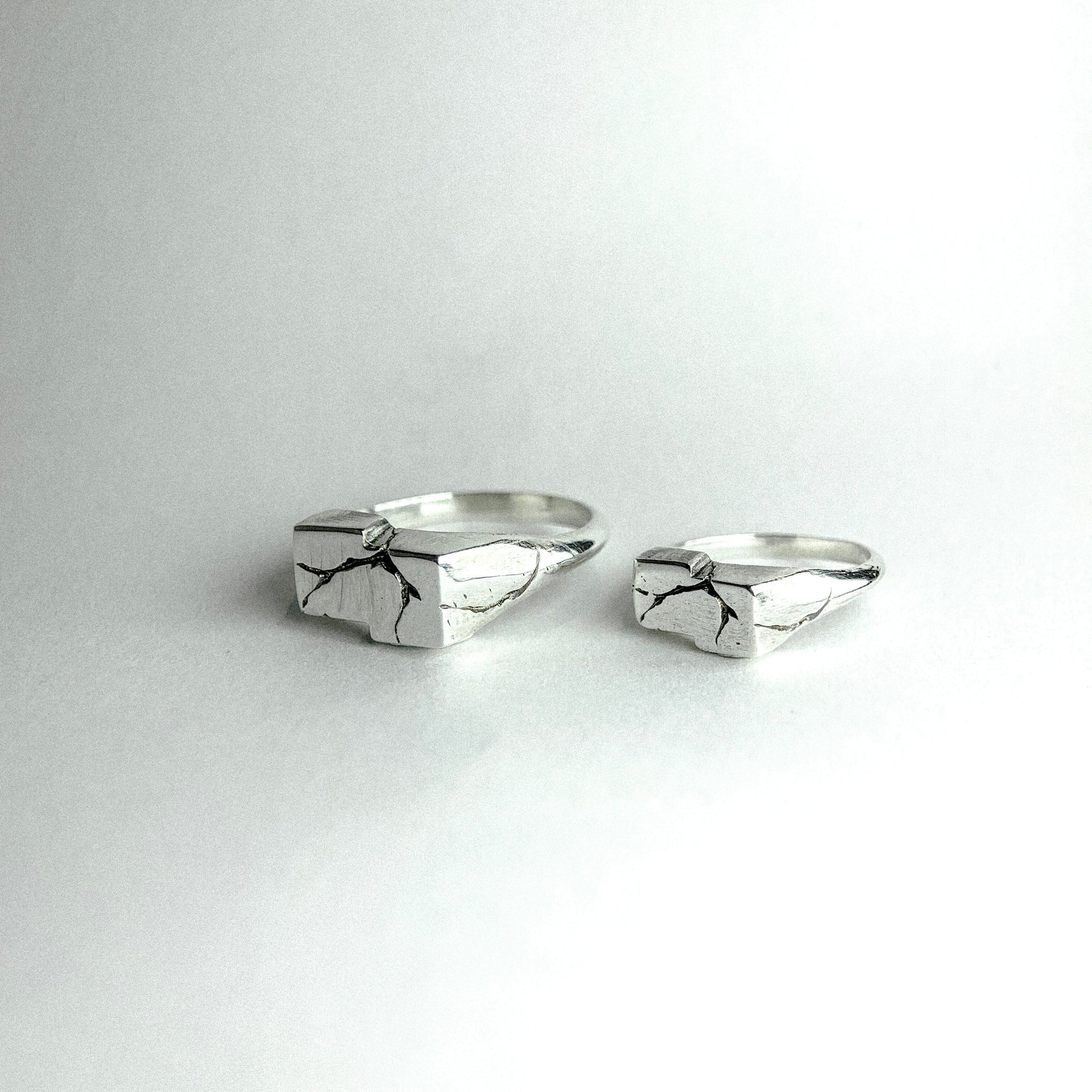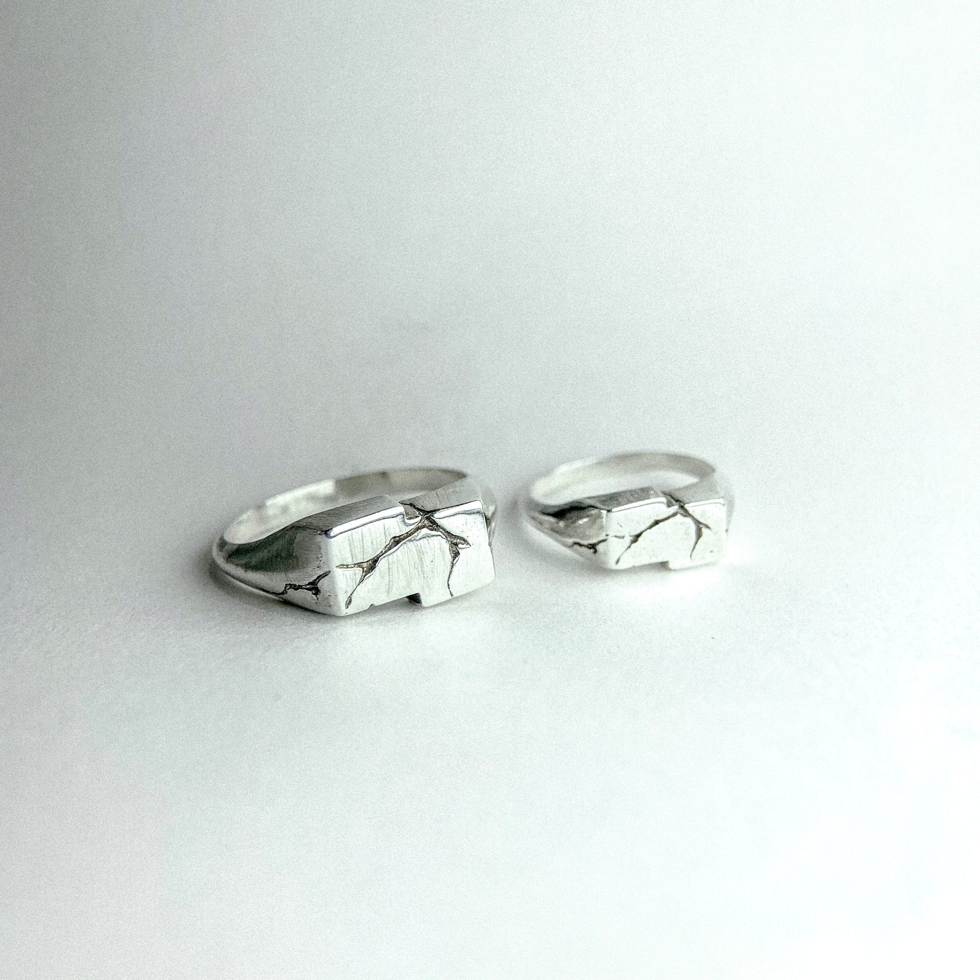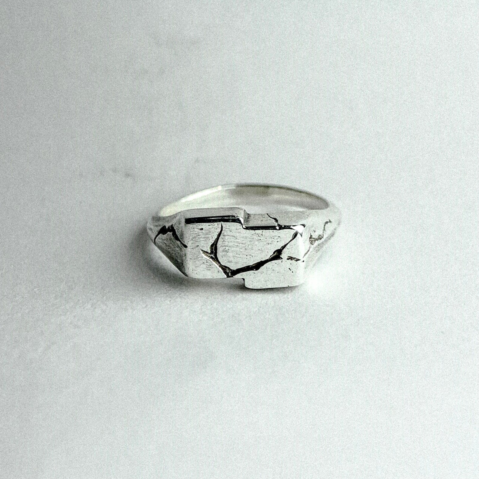 Minimalist yet bold, this sterling silver signet ring is crafted in a sleek rectangle shape and detailed with a unique crack pattern. The design captures the beauty of imperfection, symbolizing strength and character in every line. A modern statement ring with timeless appeal.