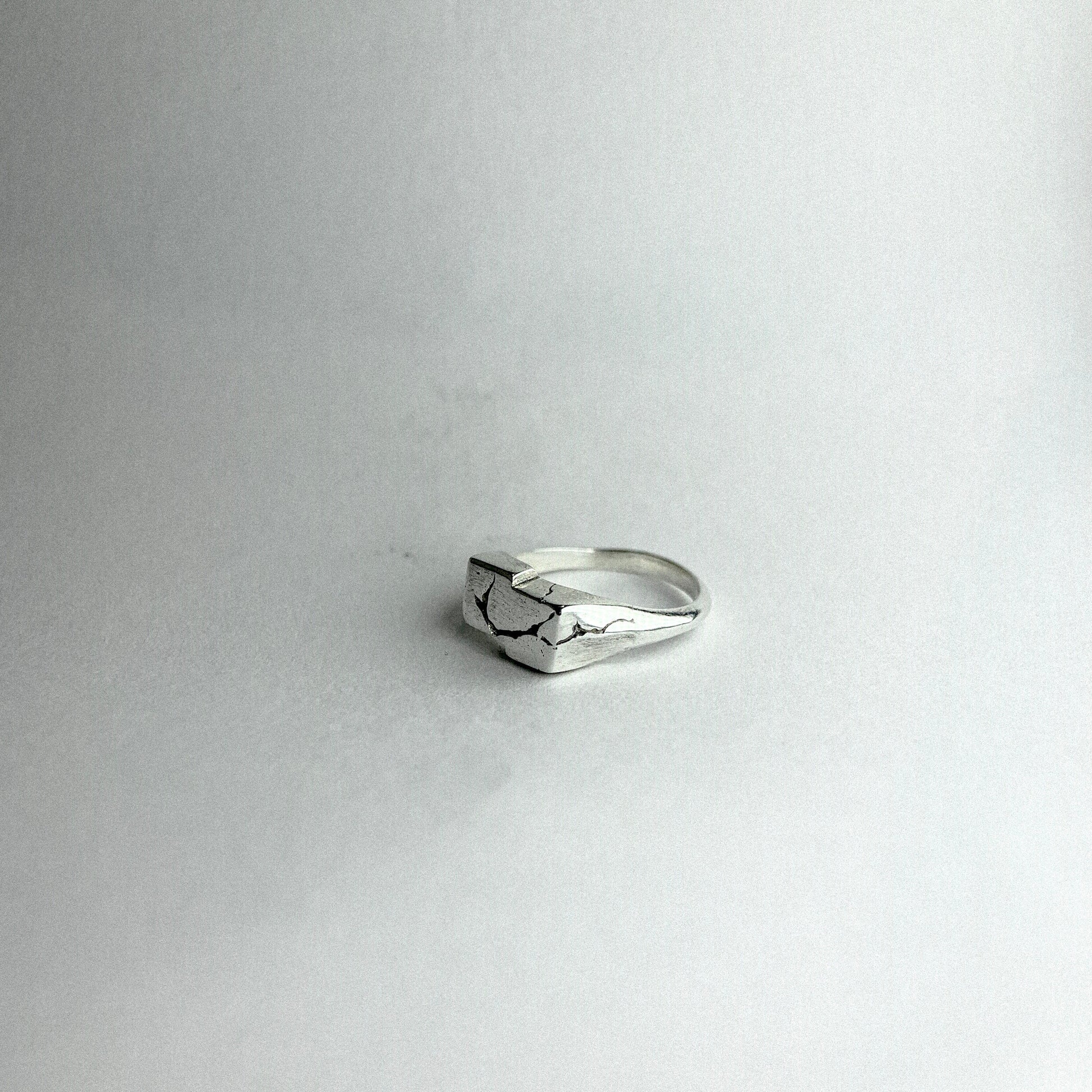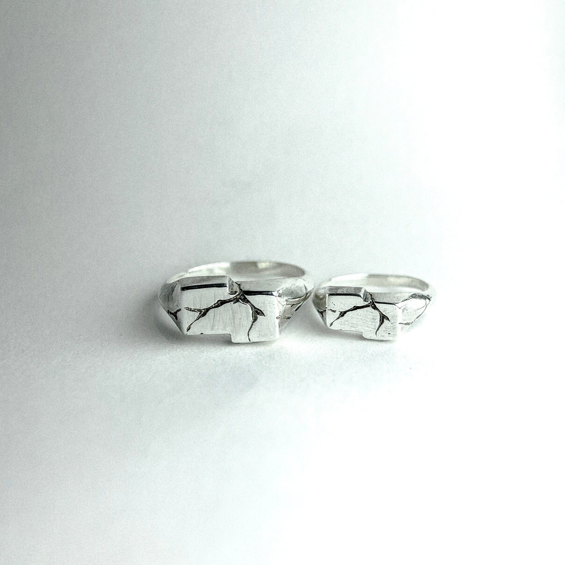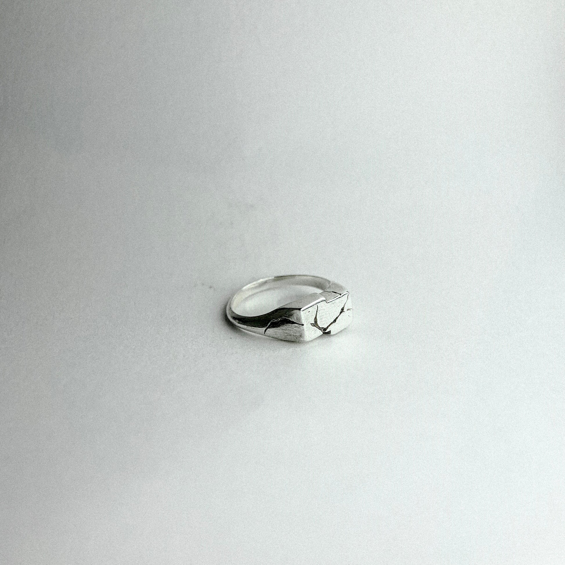 Minimalist yet bold, this sterling silver signet ring is crafted in a sleek rectangle shape and detailed with a unique crack pattern. The design captures the beauty of imperfection, symbolizing strength and character in every line. A modern statement ring with timeless appeal.