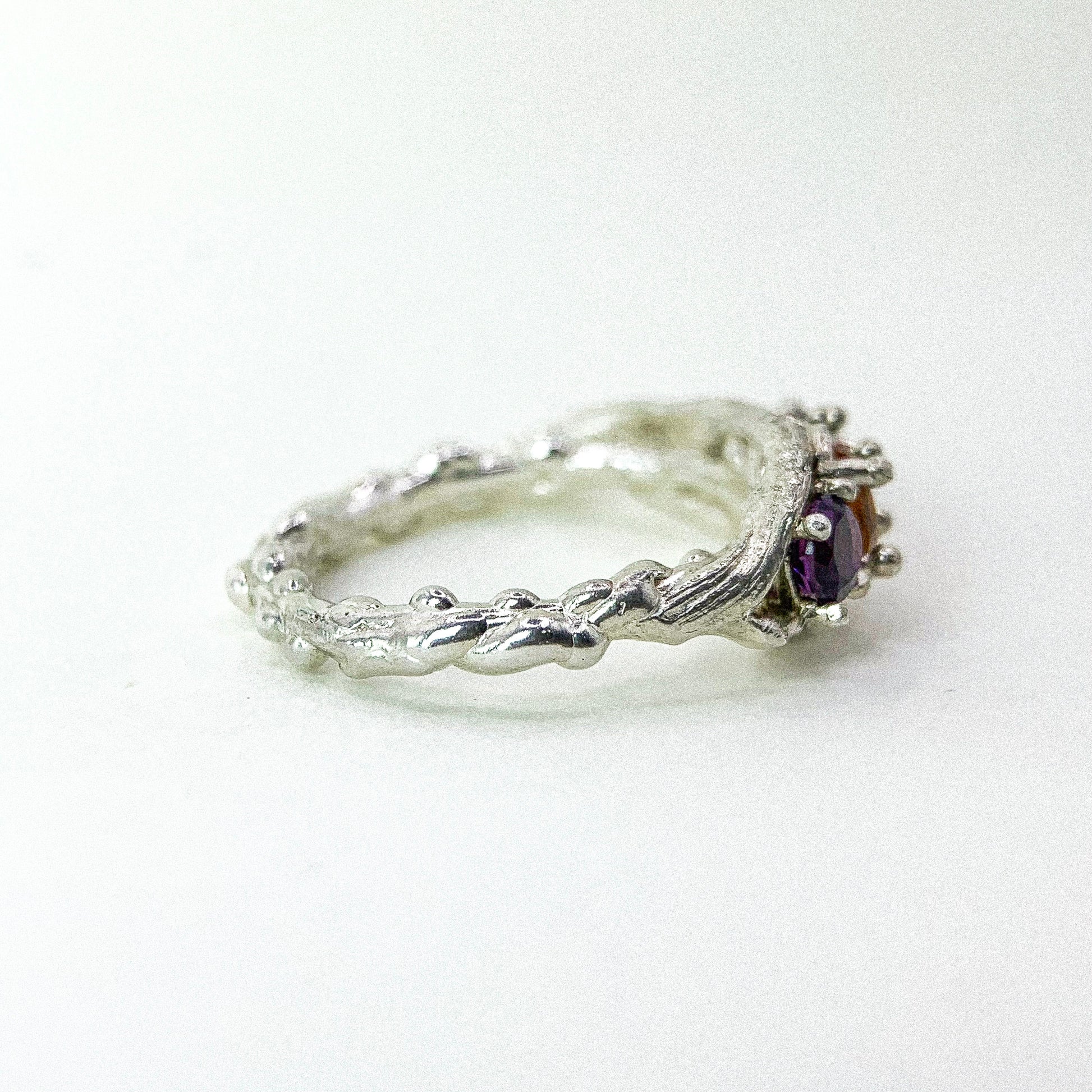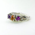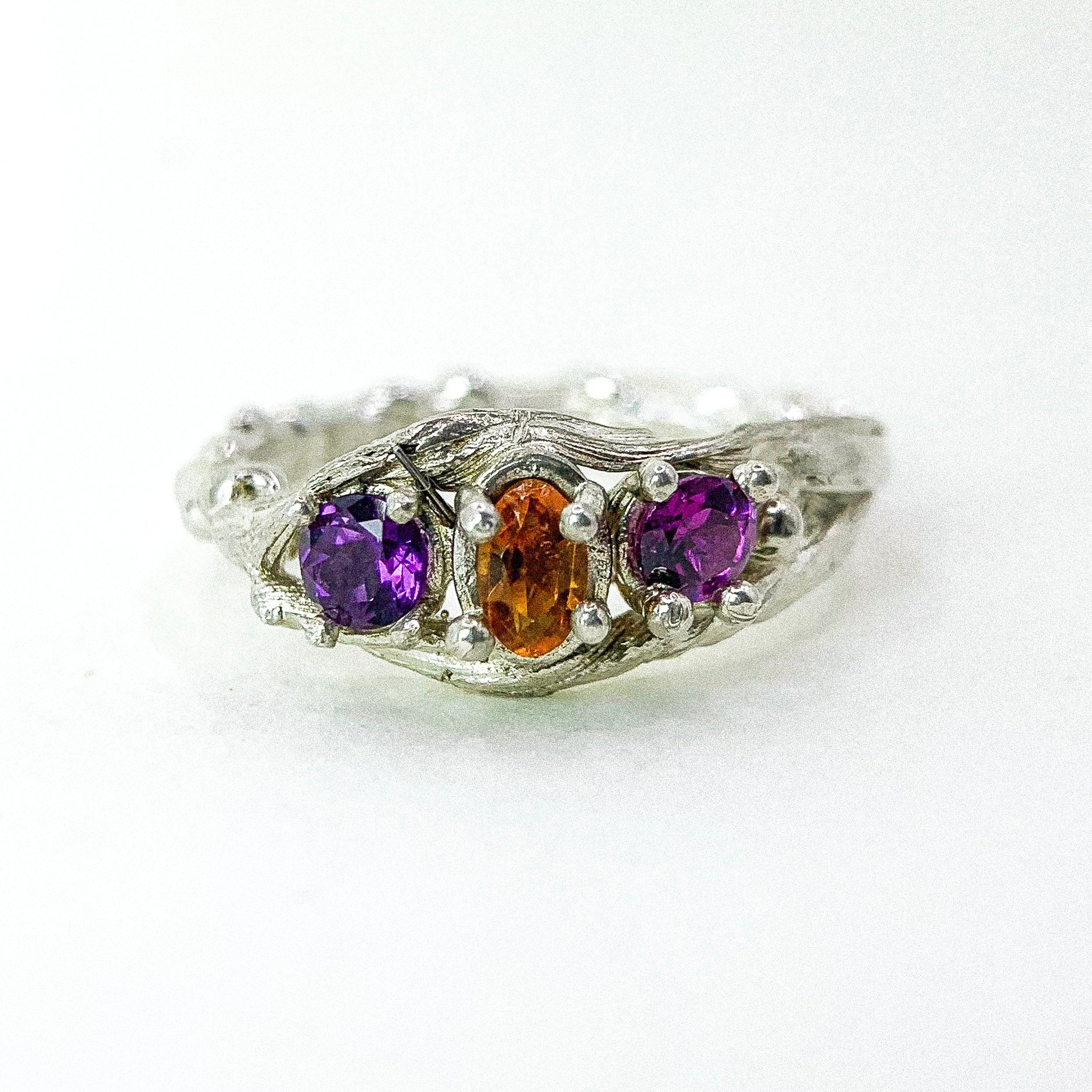 A delicately handcrafted ring featuring a harmonious trio of gemstones — a warm citrine at the center framed by two vivid amethysts. The organic 925 silver band is sculpted with soft, flowing textures, creating the look of petals gently holding each stone in place. Elegant, colorful, and nature-inspired, this piece adds a radiant touch to any jewelry collection.